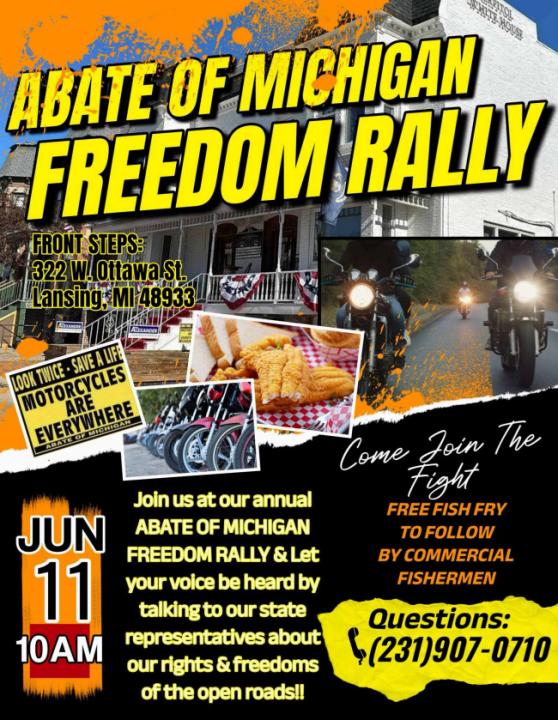 Join us at our annual ABATE OF MICHIGAN FREEDOM RALLY & Let your voice be heard by talking to our state representatives about our rights & freedoms of the open roads!!