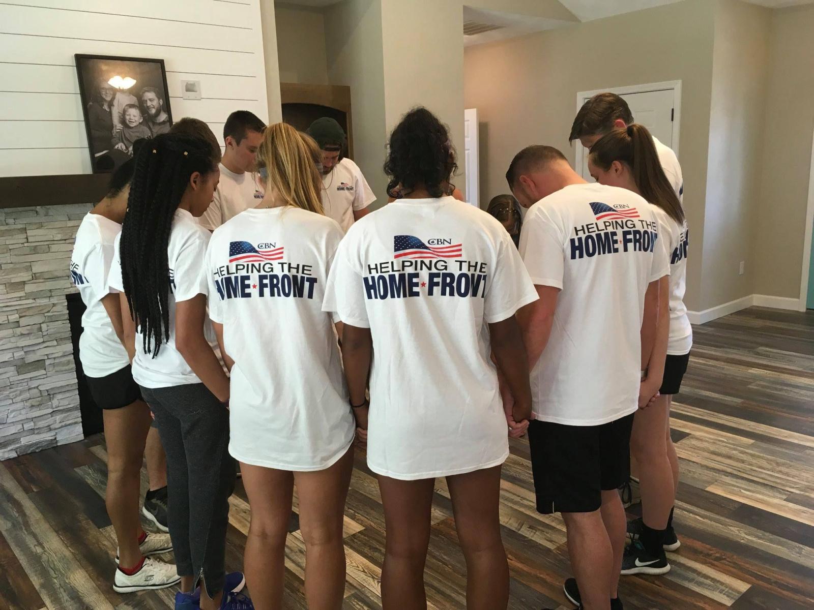Helping The Home Front volunteers praying before putting the finishing touches on a new adapted home for a deserving veteran wounded in service to our country.