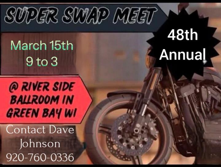 New and used motorcycle parts and accessories. admission adults $10 kids under 12 free. Vets $5 with military ID. Booths are available for $40 for 1 or $35 each for 2 or more. Contact Dave Johnson @ 920-760-0336 for booth availability.